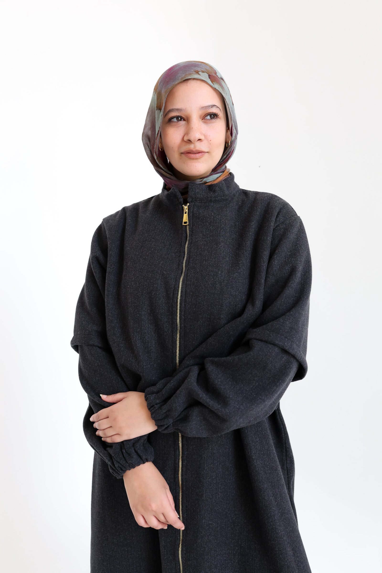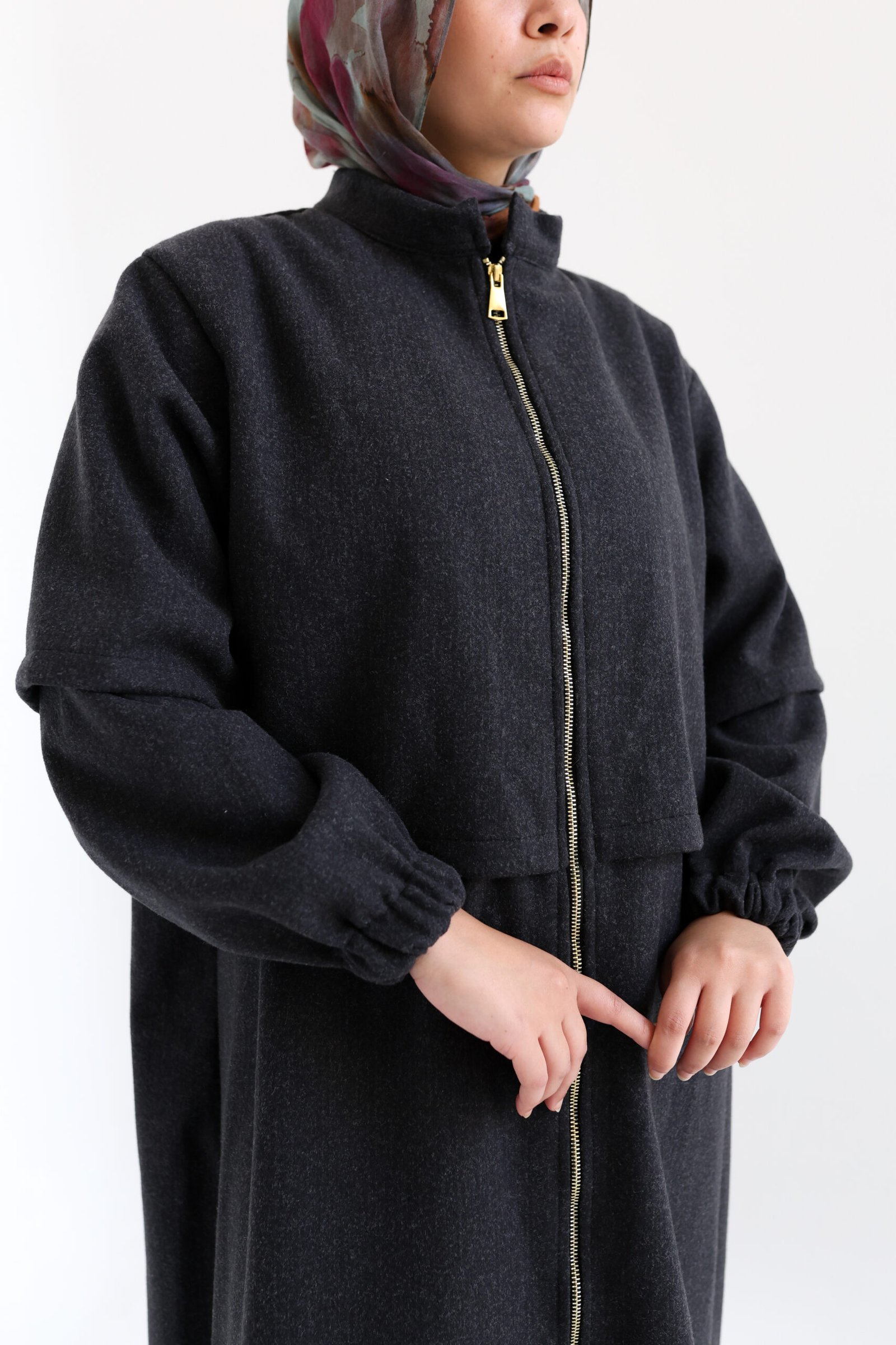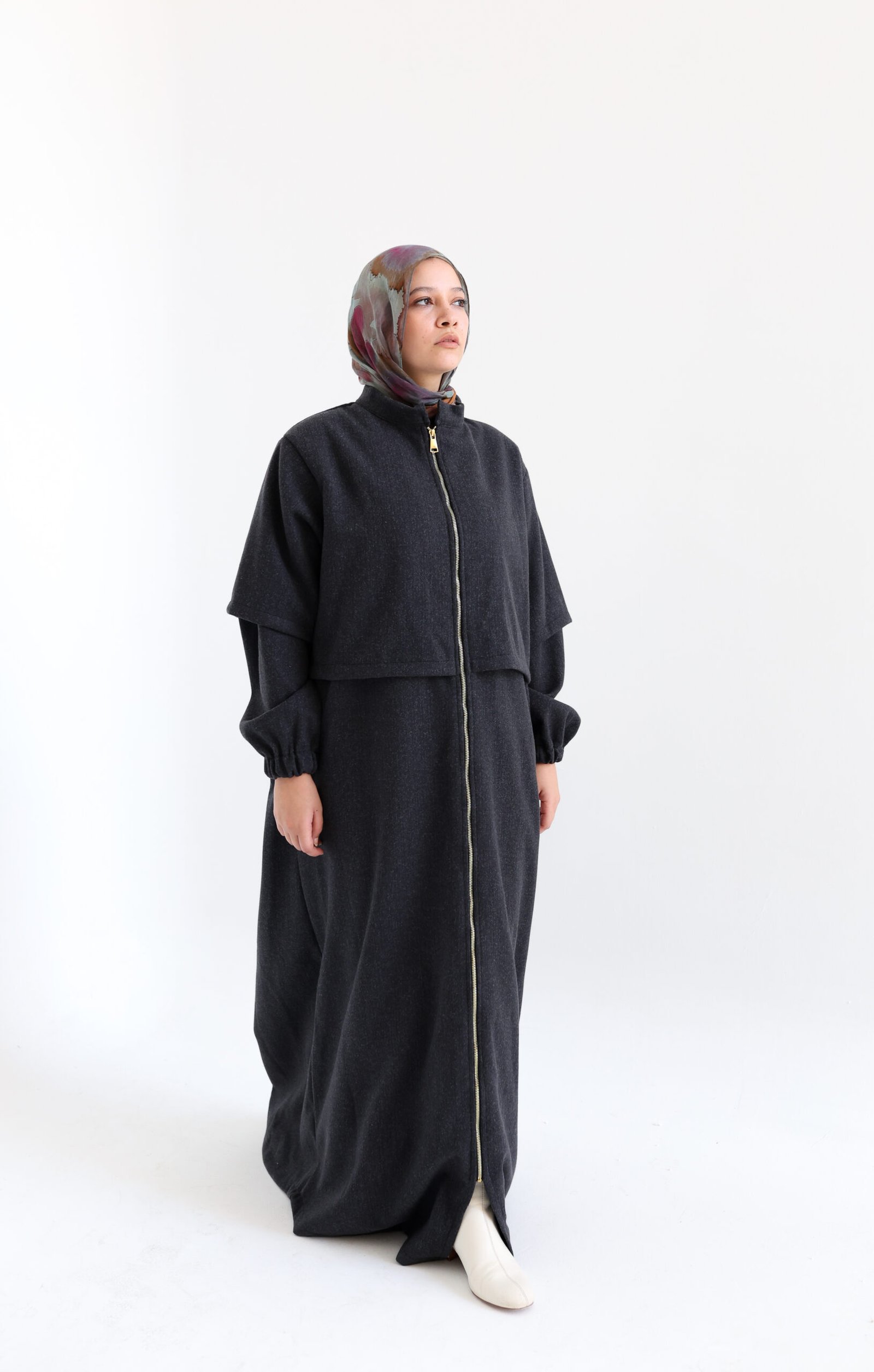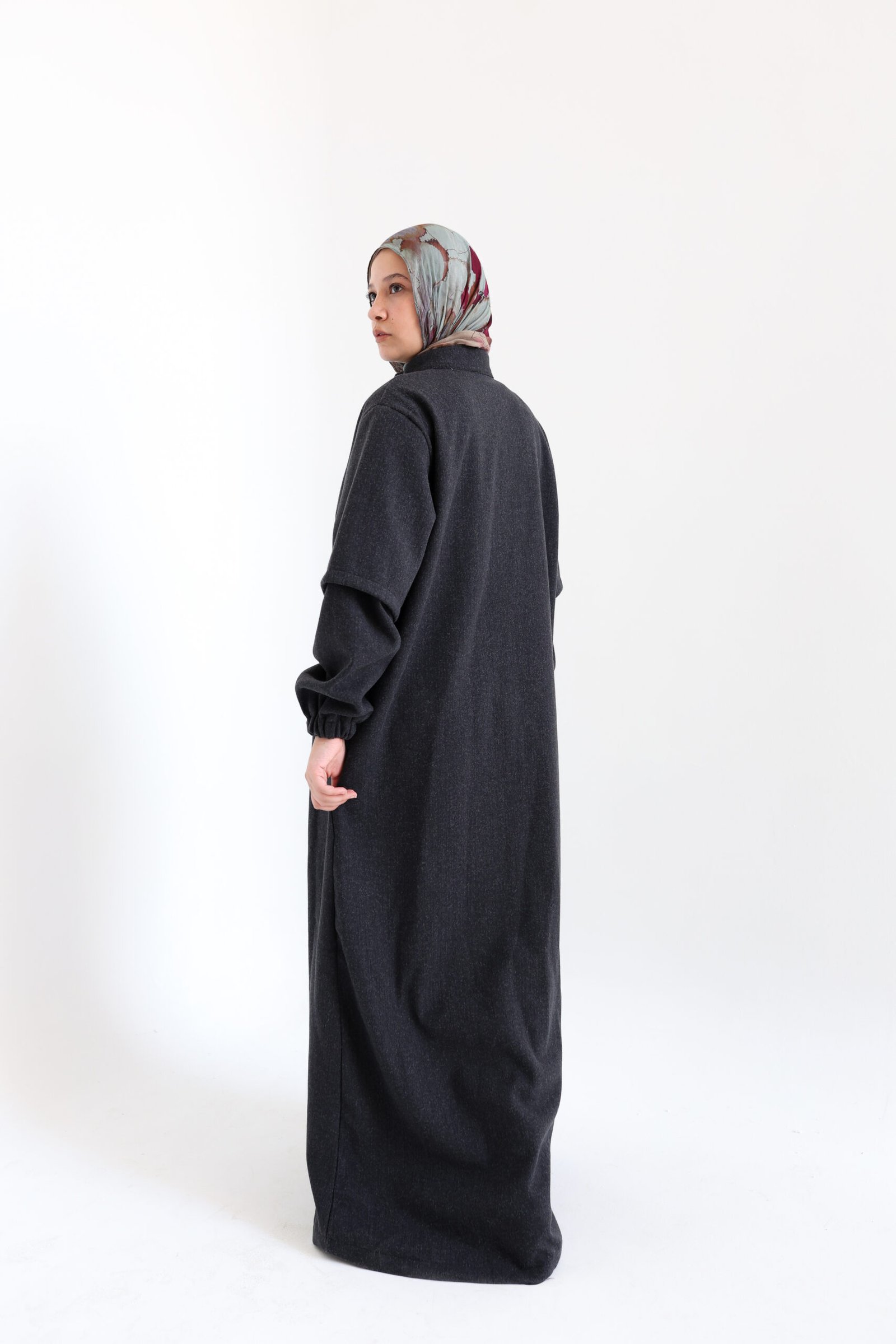 عباية ماكسي مصممة من قماش دافئ بملمس يشبه اللباد، مثالية للأيام الباردة. يضيف السحاب الكامل والأساور المطاطية لمسة عصرية مع الحفاظ على الراحة والأناقة المحتشمة