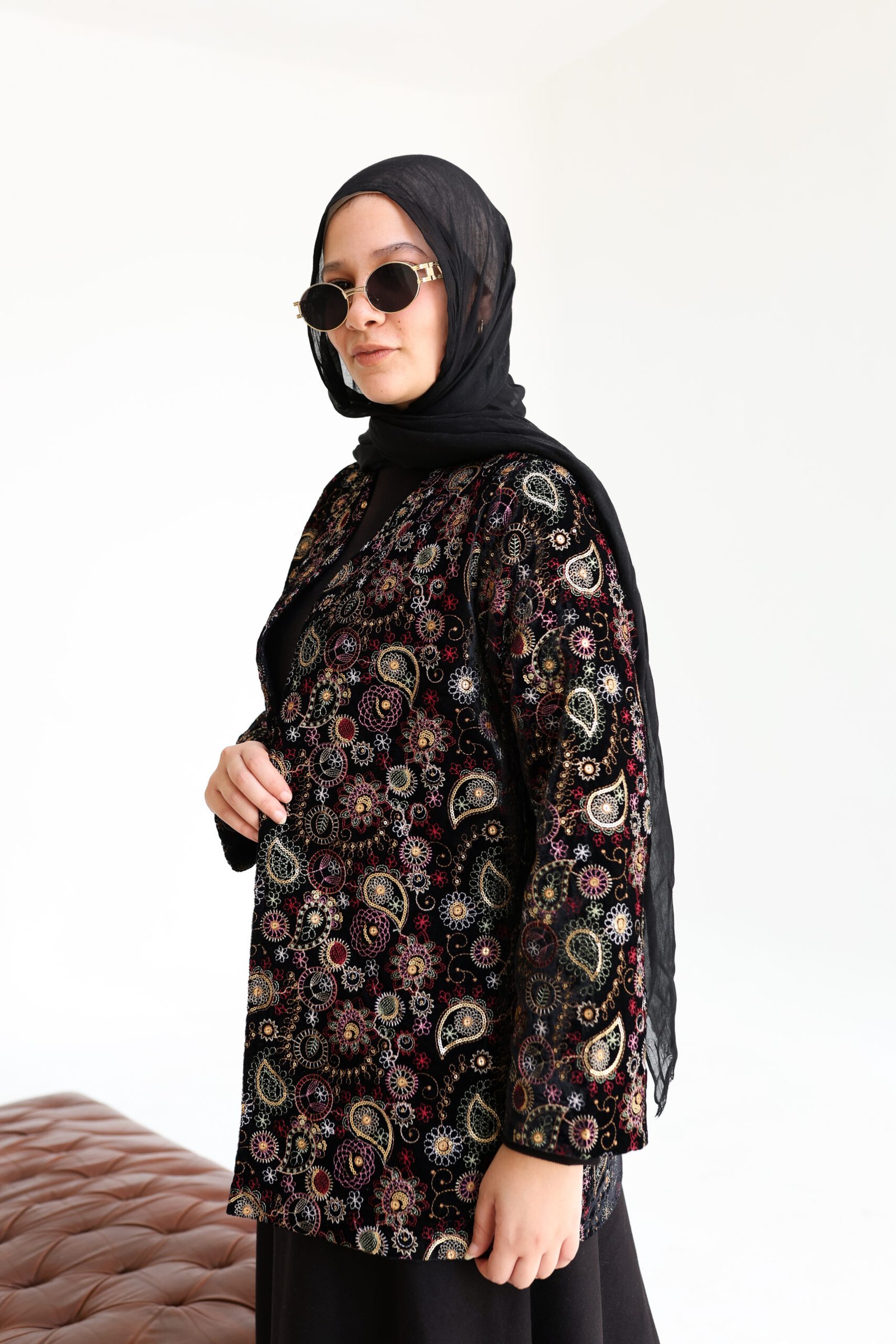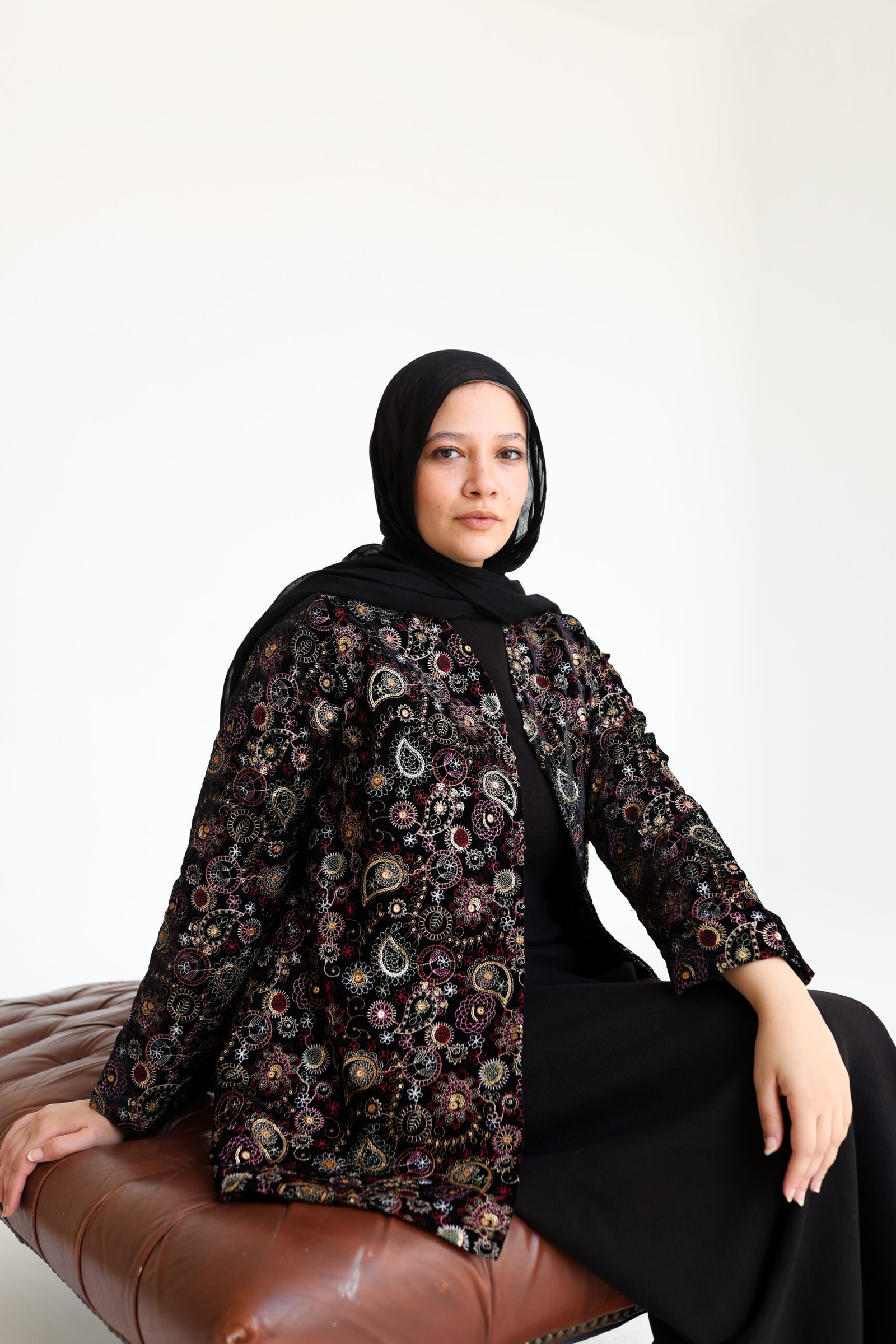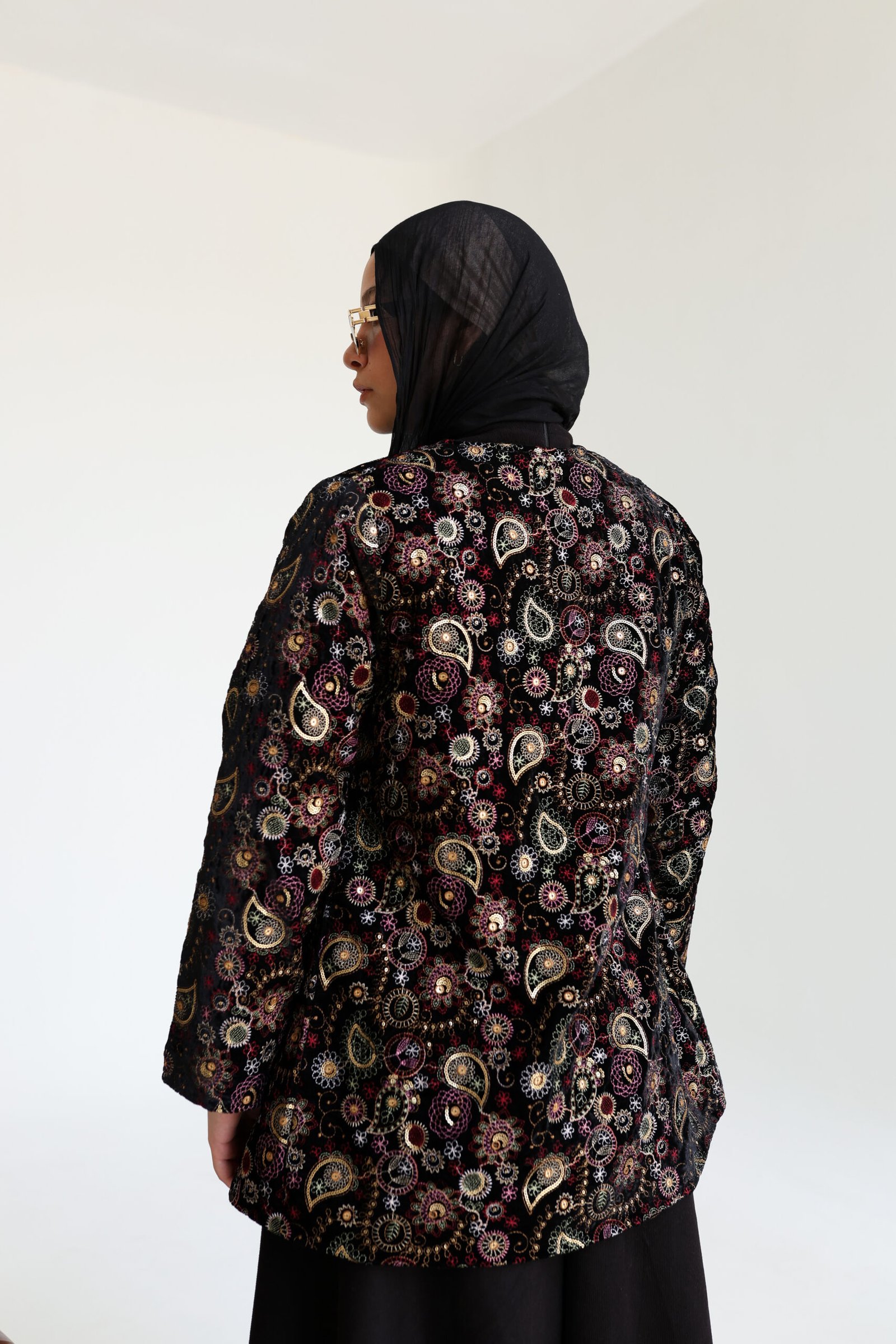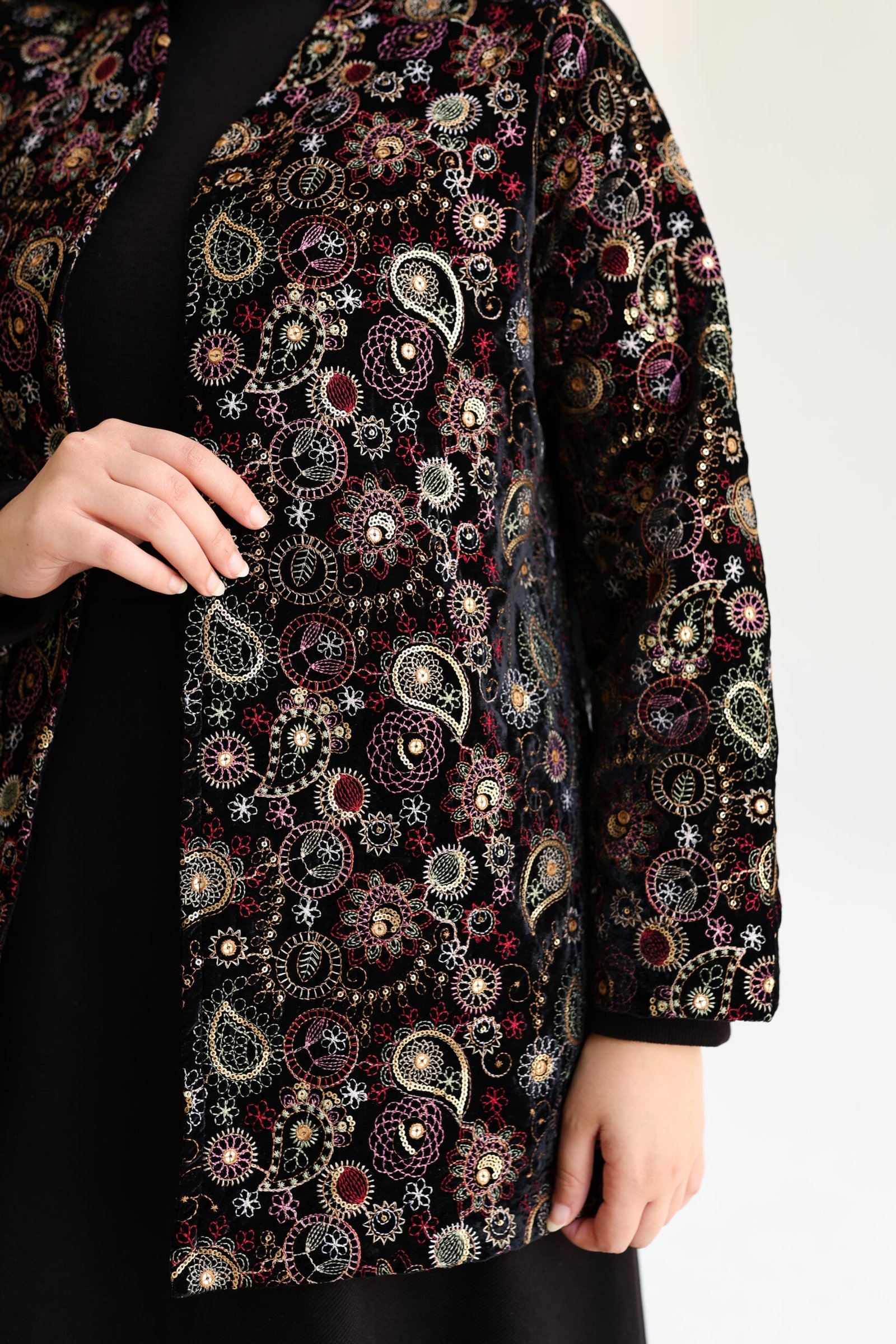 Crafted from high-quality velvet with intricate multicolored embroidery, this jacket offers a refined yet expressive look. The open-front silhouette drapes effortlessly, making it ideal for special occasions or elevating everyday ensembles