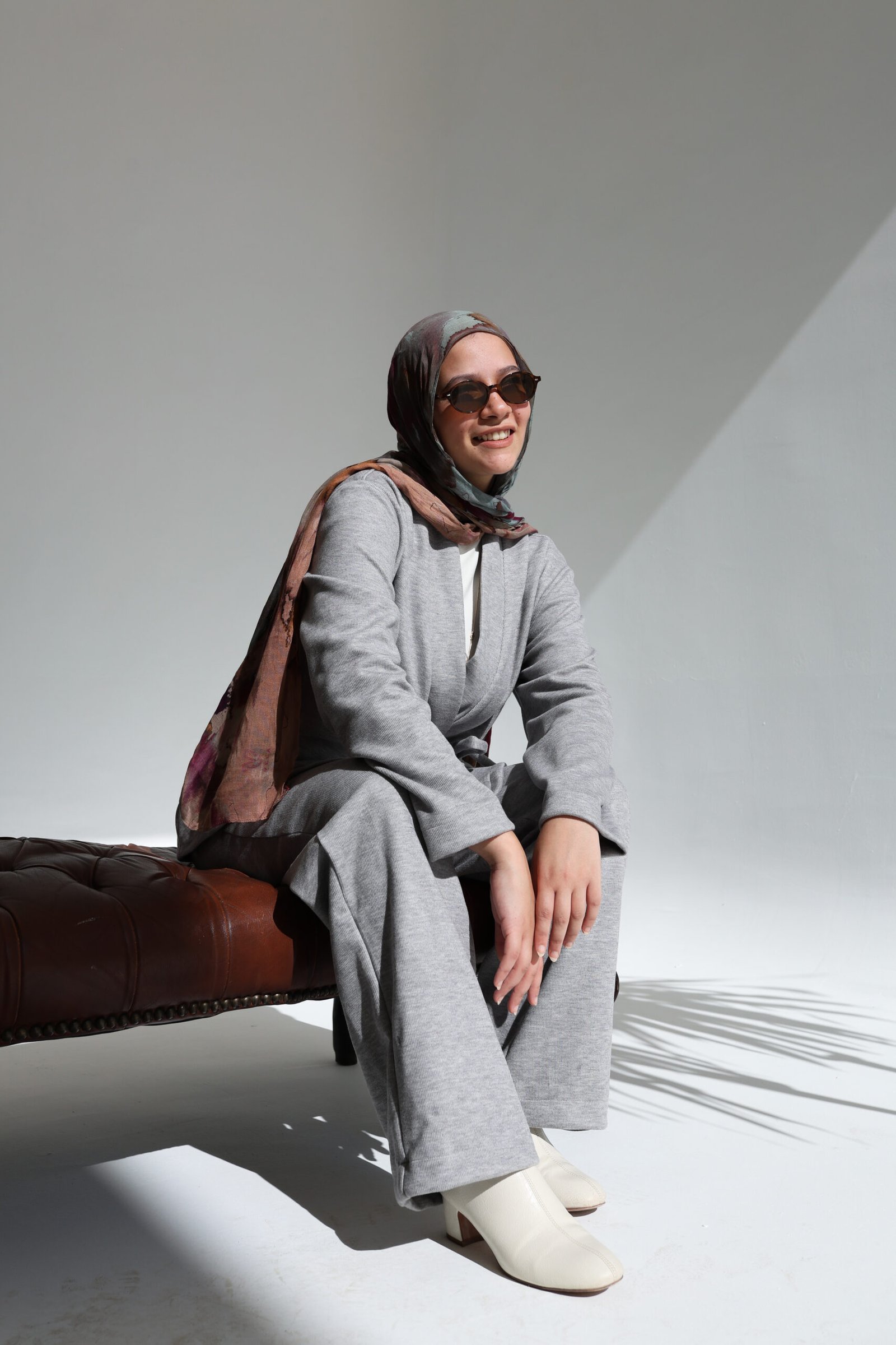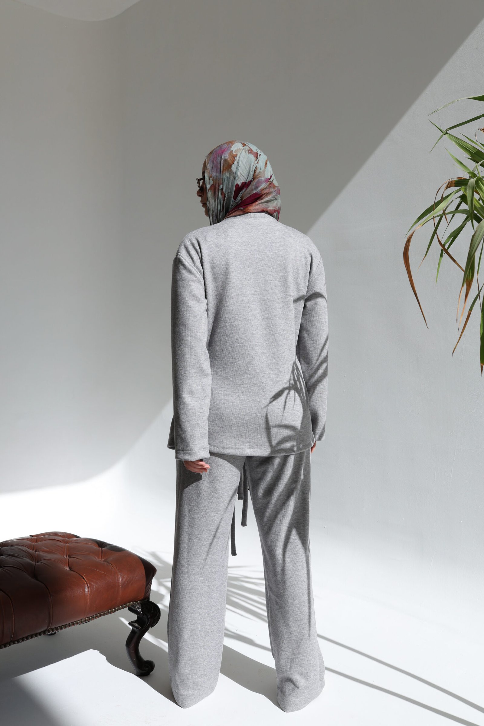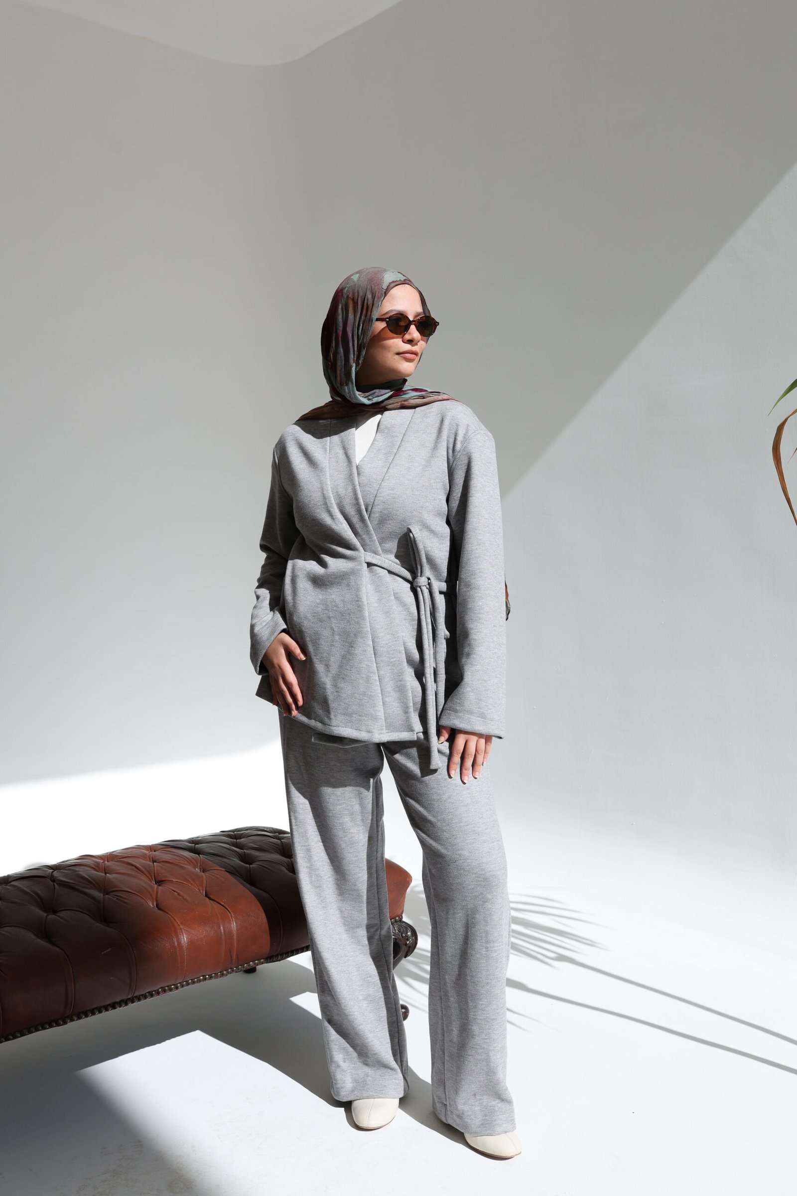 This two-piece set redefines cozy elegance. Featuring a soft wrap-style cardigan with a tie belt and matching straight-leg trousers, it offers effortless comfort with a refined, modest lounge aesthetic.